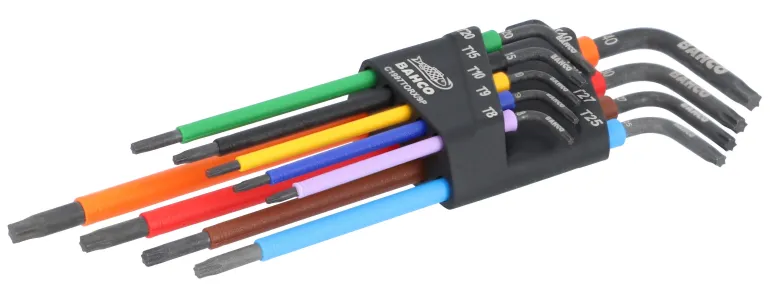 TORX®-kärkinen värillinen L-avainsarja, 9 kpl, pitkä. Sarja sisältää koot: T8, T9, T10, T15, T20, T25, T27, T30, T40. Helppo sovitustoiminto: tukeva kiinnitys ja erittäin helppo ottaa ja asettaa L-avaimet ulos ja paikoilleen ainutlaatuisen sovitusjärjestelmän ansiosta. Helppo väritunnistus koon mukaan, Bahco TORX® -väristen kärkien mukaisesti. Kestävä pidike, jossa on pehmeä tuntuma organisointiin ja turvallisuuteen. Puristettu muotoiltu kahva, jossa on pehmeä tuntuma: miellyttävä, luistamaton ote ja öljynkestävä. Fosfaattipinnoite: suojaa korroosiolta ja takaa pitkän käyttöiän. Laadukas teräs, täysin karkaistu. Pitkä varsi tarjoaa paremman vääntömomentin siirron ja saavutettavuuden. Laserilla merkitty ja siten kulutusta kestävä kokomerkintä, joka mahdollistaa nopean pääsyn kuhunkin kokoon.