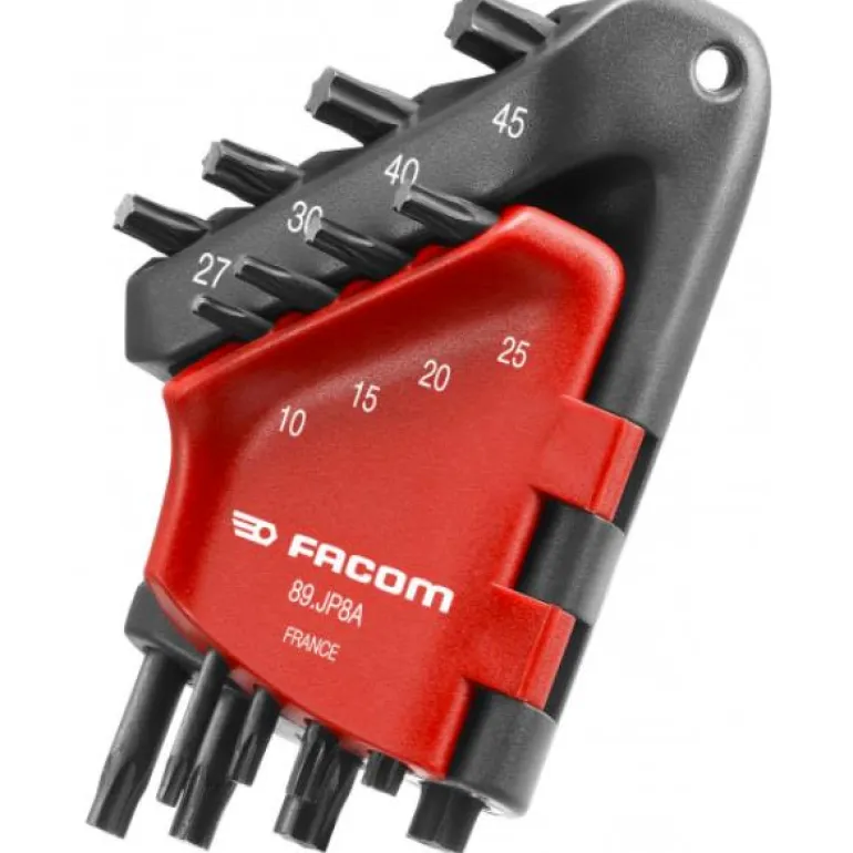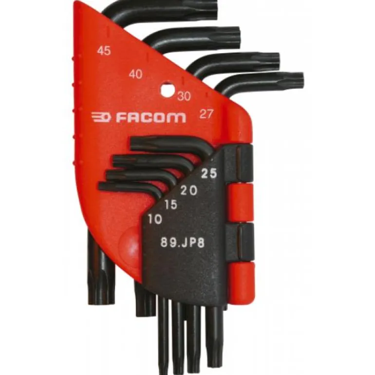 Facom 89.JL8 -torx-avainsarja sisältää kahdeksan avainta, jotka sijaitsevat kätevässä pidikkeessä. Avaimet ovat yhteensopivia standardoitujen torx-määritysten kanssa.