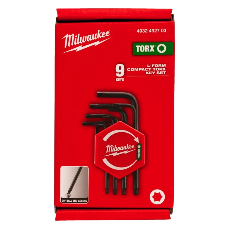 Kompakti L-muotoinen TORX-avainsarja (9-osainen), jonka kompaktit avaimet soveltuvat ahtaissa tiloissa työskentelyyn.