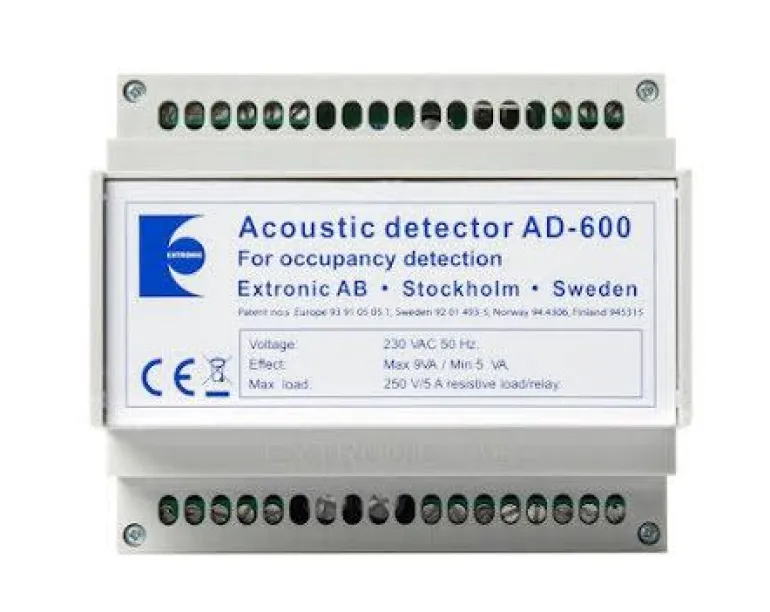 AD600 on läsnäoloilmaisin energiaa säästävään valaistuksen ohjaukseen. Ilmaisin kuuntelee ääniä kahdella eri taajuusalueilla, joita analysoidaan läsnäolon havaitsemiseksi. Matalataajuisen äänen tunnistuksen ansiosta valot syttyvät tilaan heti oven käydessä. Askeleista ja puheesta syntyvät korkeammat äänitaajuudet pitävät tämän jälkeen valaistuksen sytytettynä. Päätoimintona on valon automaattinen sytyttäminen ja sammuttaminen läsnä- ja poissaolon mukaan. Sytyttäminen ja sammuttaminen voidaan toteuttaa kahtena eri kanavana A ja B. Koska AD-600 on akustinen ilmaisin, se pystyy ”kuulemaan nurkan taakse” ja tiloissa, joissa on esteitä. Sen vuoksi se sopii erittäin hyvin porrashuoneisiin, kaapeilla ja käytävillä erotettuihin pukuhuoneisiin jne. AD-sarjan akustiset ilmaisimet täydentävät passiivisilla infrapunailmaisimilla tapahtuvaa läsnäolon tunnistusta. Ilmaisimen käyttöjännitteenä on 230 V AC. Kotelon DIN-kiskossa on tilaa kontaktoreille, joita voidaan tarvita esim. loisteputkivalaisinten ohjaukseen. AD-600:ssa on normaali muovikotelo, joka voidaan asentaa DIN-kiskoon. Koska AD-600 asennetaan sähkökaappiin, siihen on kytkettävä vähintään yksi ulkoinen mikrofoni. AD-600:aan voidaan kytkeä enintään kuusi lisämikrofonia.
