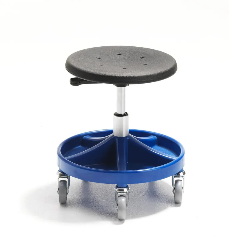 Tukeva tuoli, jossa on mukava istuin. Sopii niille, jotka istuvat usein kyyryssä. 5 lokeroa ruuveille, muttereille ja muille pienille esineille. Ergonomisella selkänojalla tai ilman. Istuin mustaa PU-vaahtomuovia.
