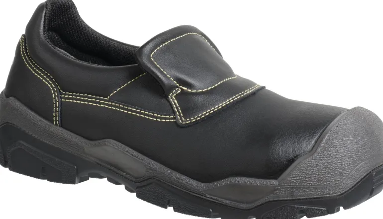 Musta turvakenkä, jossa on korkea suojaustaso, erittäin hyvä pito, erinomainen istuvuus ja erittäin hyvä iskunvaimennus. EN ISO 20345:2011, S2 SRC HRO CI.