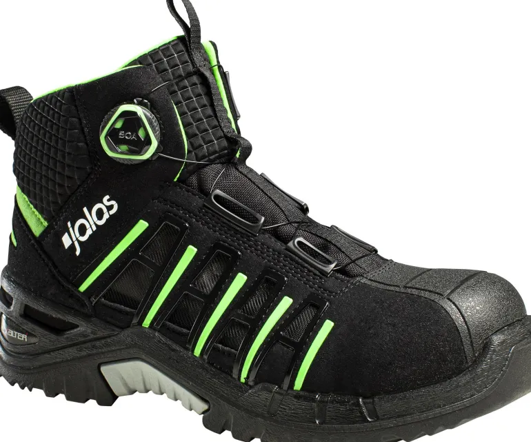 JALAS® EXALTER 9945 on varrellinen turvajalkine, jossa on kaikki mitä tarvitset useimpiin työtilanteisiin: PTC-tekstiilinen naulaanastumissuoja, alumiininen varvassuoja ja Vibram-nitriilikumipohja. Malli tarjoaa ylimääräistä nilkkatukea ja PORON® XRD™-iskunvaimennus estää jalka- ja selkävammat. Verkkopäällysteiset tuuletusaukot päällisessä pitävät jalat viileinä ja estävät hiekan pääsyn jalkineisiin. BOA®-kiinnitysjärjestelmä helpottaa jalkineen pukemista ja riisumista.