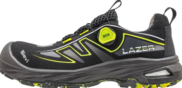 Lazer Roller+ -turvajalkineessa on aukollinen kantarakenne. FlexEnergy® -joustoelementti näkyy jalkineen kannassa olevista aukoista, jotka mahdollistavat elementille suuremman liikkuvuuden lisäten näin jalkineen joustavuutta. BOA® Fit System -kiinnitysmekanismi mahdollistaa nopean pukemisen ja riisumisen. Erinomaisen pidon varmistaa Sievi TractionPro® -kitkapohja.