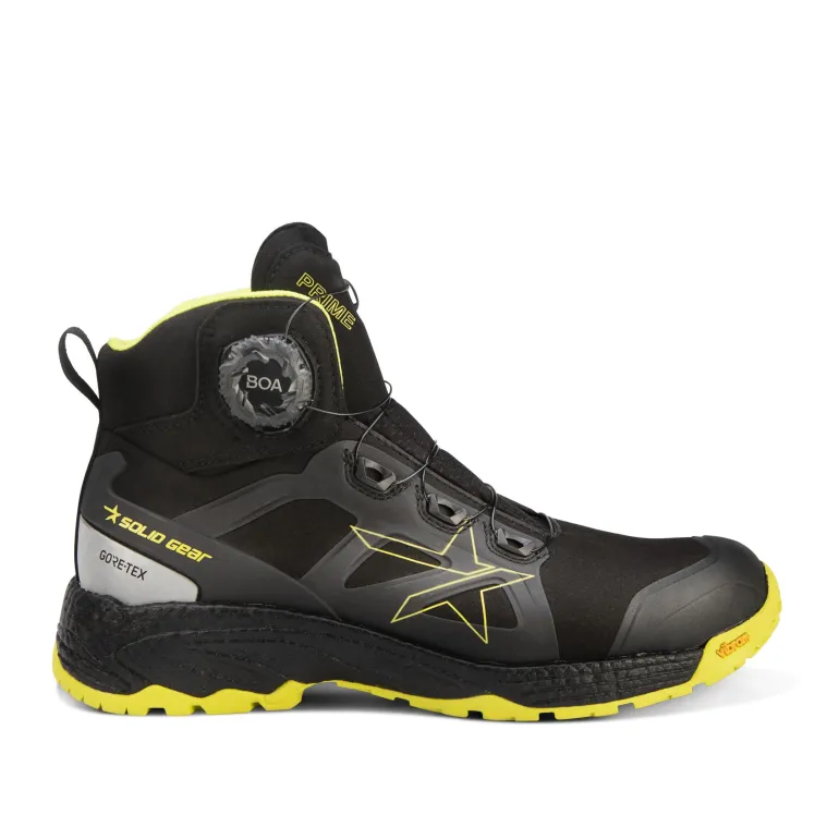 Solid Gear Prime GTX Mid on suosittu turvakenkämalli, jonka välipohja on 100-prosenttista ETPU-materiaalia, mikä takaa erittäin hyvän mukavuuden ja energian palautuksen. Turvakengässä on Vibram-ulkopohja, erittäin kestävä kumipohja, joka takaa erittäin hyvän pidon epätasaisilla pinnoilla ja lämmönkeston jopa 300 asteessa. Pohjan kiertojäykkyys parantaa ergonomiaa ja päällä olevat läpinäkyvät lenkit parantavat ergonomiaa. Kengän päällinen on kestävää mikrokuitua, jossa on vedenpitävä ja hengittävä GORE-TEX-kalvo. Kieli on suunniteltu ergonomiseksi ja GORE-TEX Stretch -teknologia yhdessä korkean kantavahvikkeen ja BOA Fit System -järjestelmän kanssa antaa Solid Gear Prime GTX: lle ainutlaatuisen istuvuuden.