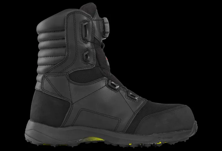 Välipohja komposiittimateriaalista antaa jalalle suojaa alhaaltapäin sekä eristää kylmältä. Välipohja on myös iskuja vaimentava, mikä vähentää jalkaan kohdistuvaa rasitusta. Kengän istuvuus on erinomainen suojatun kantapääkupin ja BOA® Fit System-nauhakiristysmekanismin ansiosta – erinomaista käyttömukavuutta lisää myös anatomisesti muotoiltu lesti. Pohja on öljynkestävä ja varustettu 16:lla dynaamisella BUGrip®-nastalla optimaalista pitoa varten. Jalkine on sertifioitu suojaluokalla S3 ja on kaikkien ISO 20345-standardin vaatimusten mukainen (esimerkiksi varvassuoja komposiittimateriaalista).