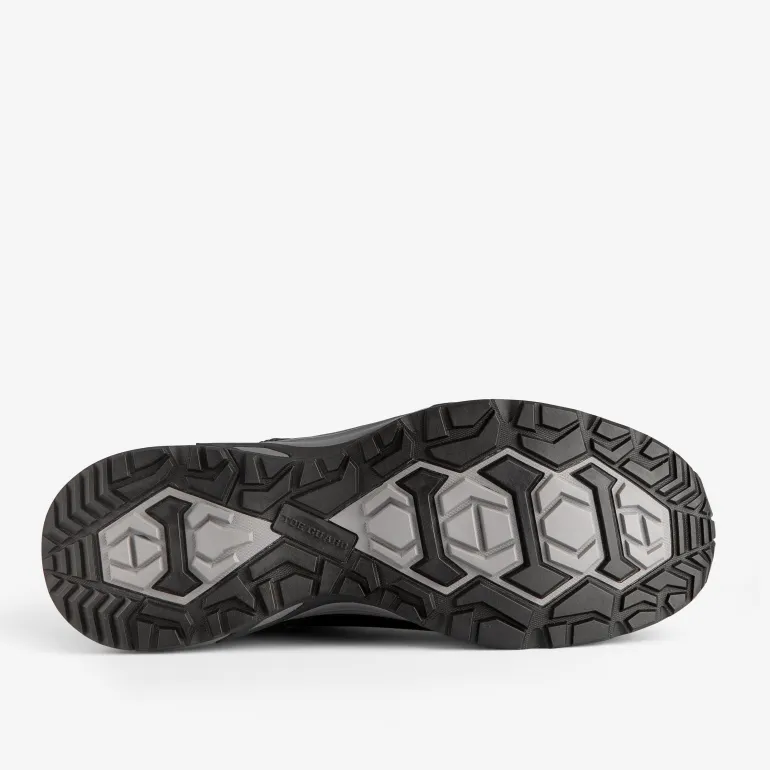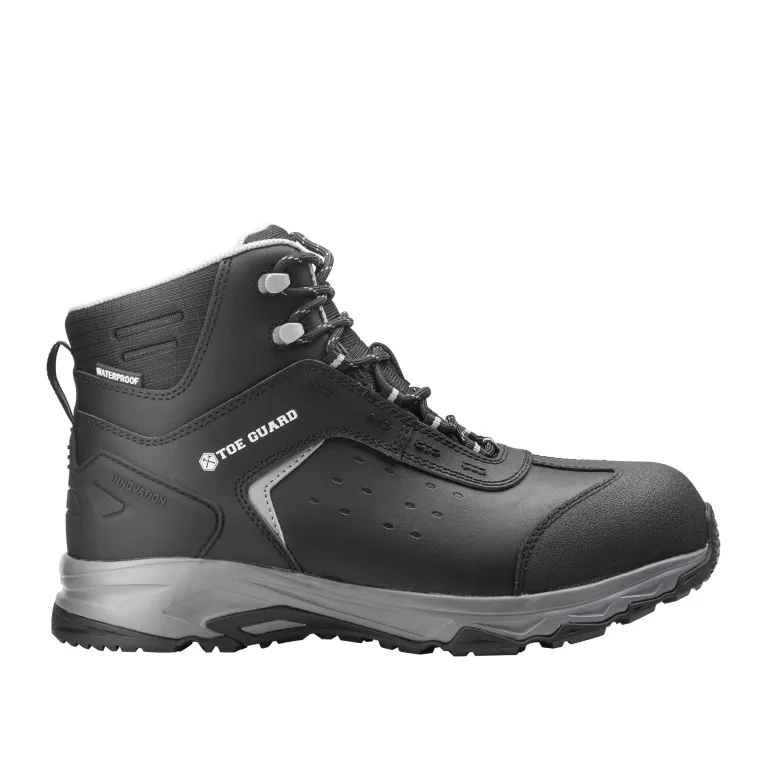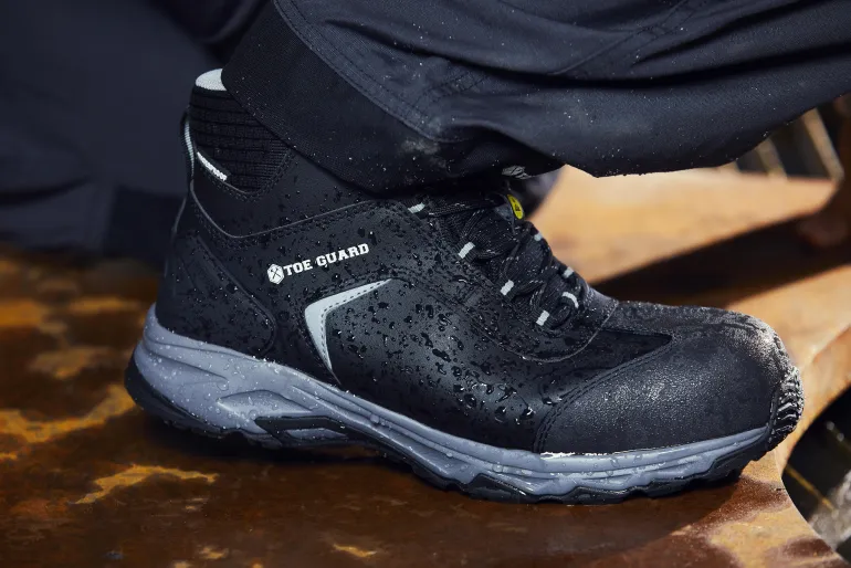 Toe Guard Wild WR Mid on turvajalkine PU-pinnoitetusta parkitusta nahasta, joka tilavalla istuvuudellaan tarjoaa optimaalisen mukavuuden. PU-vahvistus varvasosassa lisää kestävyyttä. Käyttömukavuutta edistää yksinkertainen muotoilu ilman ylimääräisiä yksityiskohtia ja saumoja sekä tekstiilinen varsi. Vedenpitävä kalvo estää veden läpäisyn kenkään. Kengässä myös öljyä ja lämpöä kestävä kuminen ulkopohja, joka on kevyt hyvällä pidolla. ESD-testattu standardin BS EN IEC 61340-4-3: 2018 mukaan. Päällinen: Nahka ja ripstop-materiaali. Vuori: Verkko. Kalvo: Vedenpitävä. Ulkopohja: Lämpöä kestävä kumi, jossa hyvä pito. Välipohja: EVA. Pohjallinen: Kosteutta siirtävä PU-vaahtomuovi hyvällä hengittävyydellä.