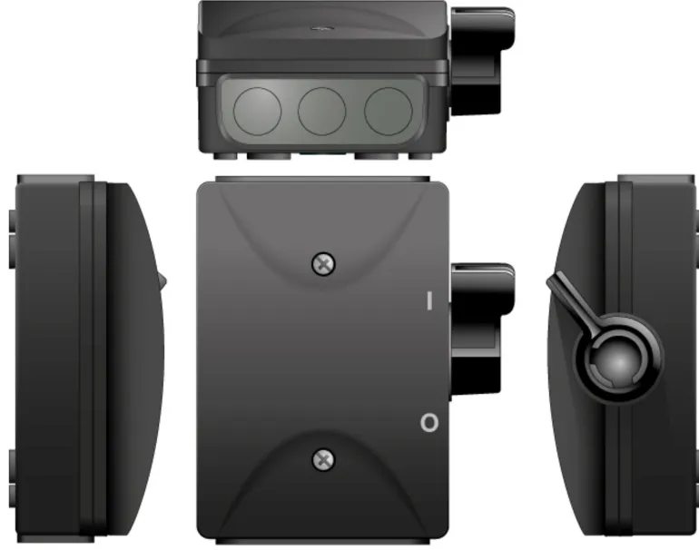 Pinta-asennettava turvakytkin. Varustettu sisäänrakennetulla jännitteenpoistolla yhdelle tai kahdelle lähtevälle liitäntäjohdolle ja kolmella kaapelin sisäänmenolla ylä- ja alareunassa.