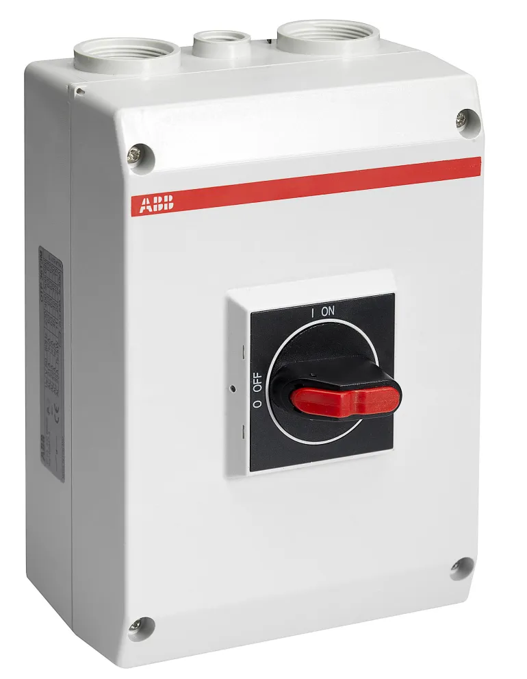 Muovikoteloitu 45 A:n 3-napainen turvakytkin. Apukoskettimella.