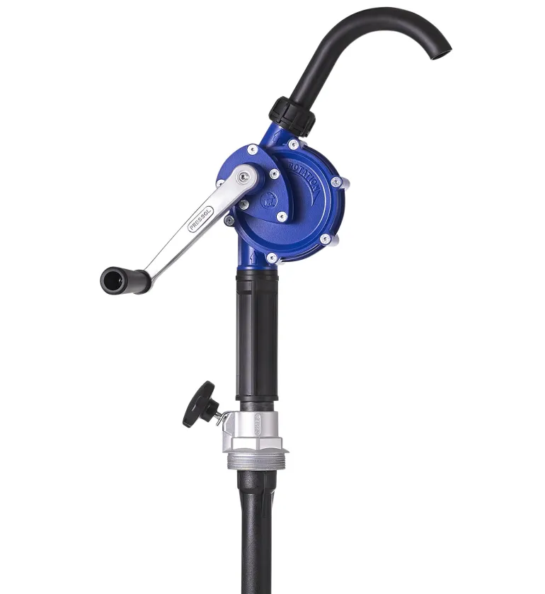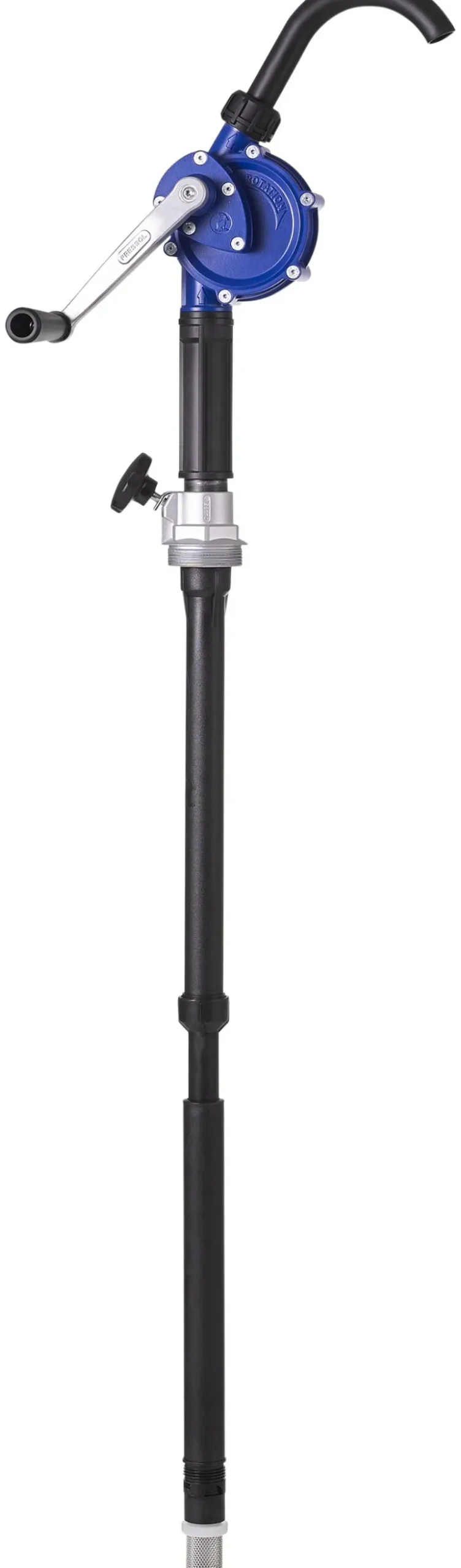Pyörivä itseimevä käsipumppu kolmiosaisella imuputkella 60 ja 200 litran tynnyreille. Dieselille, petrolille, leikkuuöljylle, moottoriöljylle ja voiteluöljyille SAE 140:een asti. Ei bensiinille, biodieselille, vedelle tai kemikaaleille. Tämän pumpun tiivisteet kestävät suositeltuja nesteitä normaalissa lämpötilassa. Muissa käyttötarkoituksissa toimivuutta ja kestävyyttä ei voida taata. Liitosmutteri M64x4 ja 2″:n putkikierre. Kapasiteetti noin 6–21 l/min. Kokonaispituus 1290 mm. Paino 6,5 kg.
