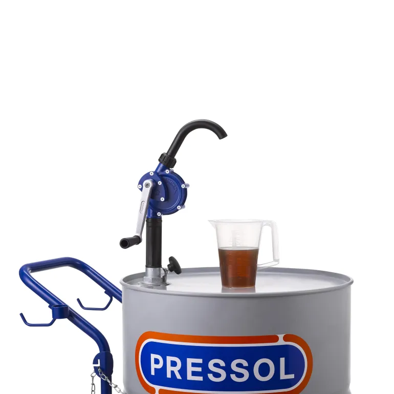 Pyörivä itseimevä käsipumppu kolmiosaisella imuputkella 60 ja 200 litran tynnyreille. Dieselille, petrolille, leikkuuöljylle, moottoriöljylle ja voiteluöljyille SAE 140:een asti.