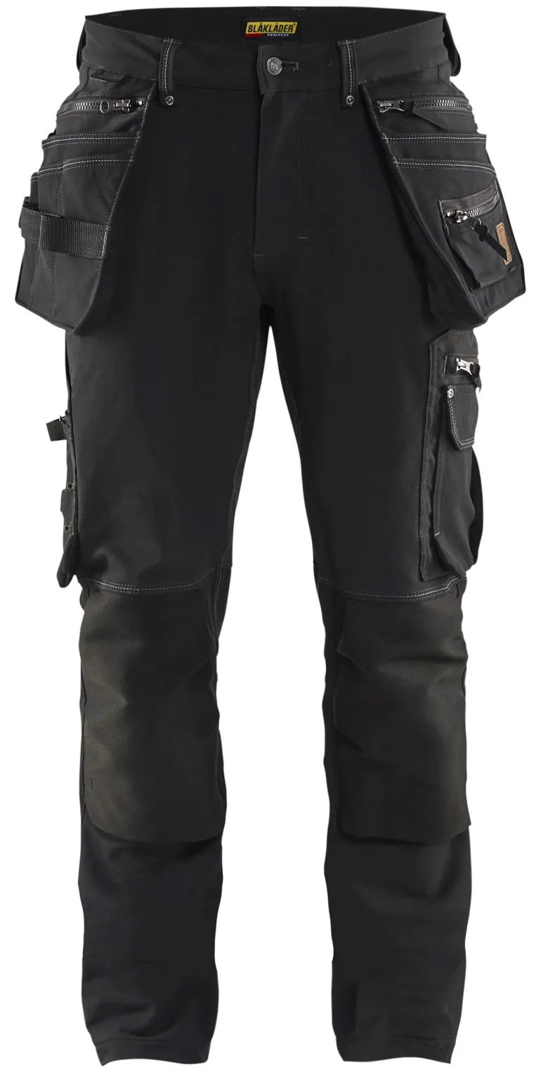 Neljään suuntaan joustavat housut. Vahvikkeet lahkeensuiden sisäpuolella. Sepalus muovivetoketjulla. Leveät lenkit takana ja sivuilla. Sivuilla kaksi lenkkiä, joissa napit vasaranpidikkeille. Irrotettava henkilökorttitasku. Metallinapit. Puukkopidike napilla. D-rengas vyötäröllä. Sisäsaumassa kolmipisto-ommel. FICKOR: Laskokselliset takataskut. Laskoksellinen reisitasku läpällä ja tarranauhakiinnityksellä, sisäpuolinen puhelintasku verkkomateriaalia. Vetoketjullinen reisitasku. Avotaskut. Polvisuojataskut. Naulataskut – erittäin leveät, varustettu työkalulenkeillä, työkalulokeroilla ja vetoketjullisilla lisätaskuilla. Vahvistettu taittomittatasku, jossa puukkopidike ja kynätasku. Polvitaskuissa joustavat CORDURA®-vahvikkeet. Vahvistetut naulataskut, taittomittatasku, takataskut ja lahkeensuiden takaosa. 4-suuntainen joustomateriaali. Soveltuu polvisuojataskuihin, jotka sopivat polvisuojiin 4027. Heijastinyksityiskohdat lahkeissa. Materiaali: 82 % polyamidia, 18 % elastaania, dobby water repellent 4-way stretch, 330 g/m2. Pesuohje: 40 °C. Ei valkaisua. Ei kuivapesua. Ei silitystä. Älä käytä kuivausrumpua.