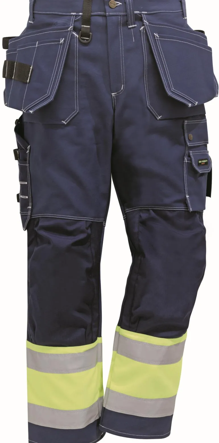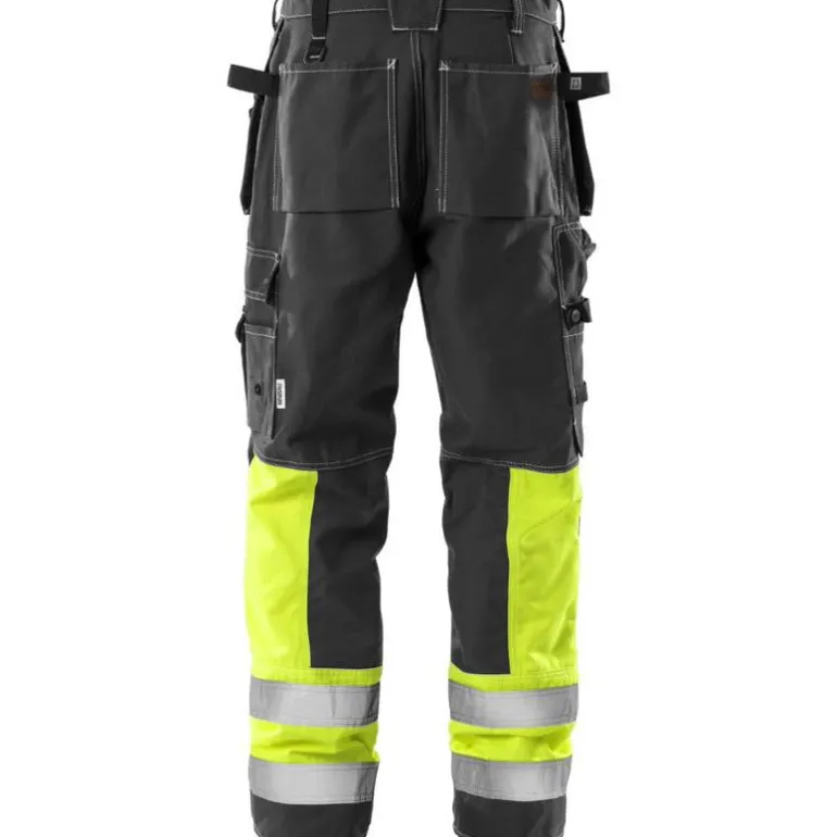 Huomiovärihousut FAS-puuvillaa, kaksi vapaasti riippuvaa, CORDURA-vahvistettua sisääntaitettavaa naulataskua – toisessa lisätasku, toisessa 3 pienempää taskua ja työkalulenkit. Housuissa on useita muita taskuja, kuten CORDURA-materiaalista valmistettu taittomittatasku, joka on sijoitettu kätevästi sivusauman päälle, työkalutasku ja kynätasku sekä kaksi nappia ja lenkkiä puukolle.