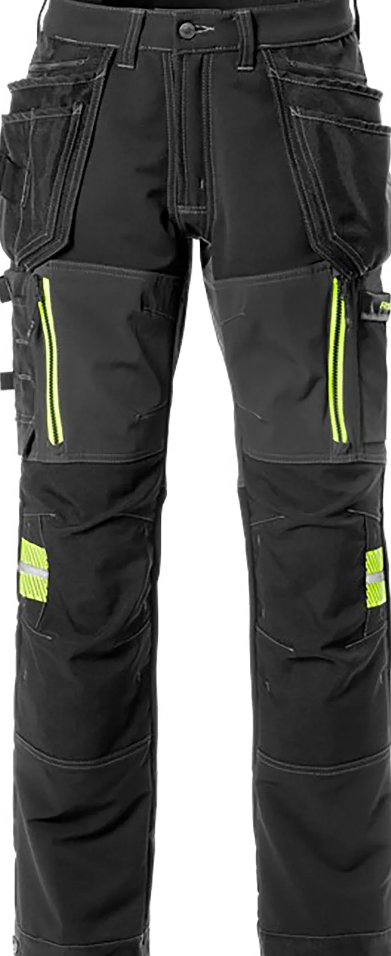 Työhousut kestävästä ripstop-materiaalista, reisissä ja takaosassa neljään suuntaan joustavaa materiaalia ja vyötäröllä joustinneulosta. Housuissa on erilaisia taskuja, kuten kaksi irrallista CORDURA-naulataskua ja yksi CORDURA-mittatasku työkalutaskulla, kynätaskulla ja napilla sekä veitsilenkillä.