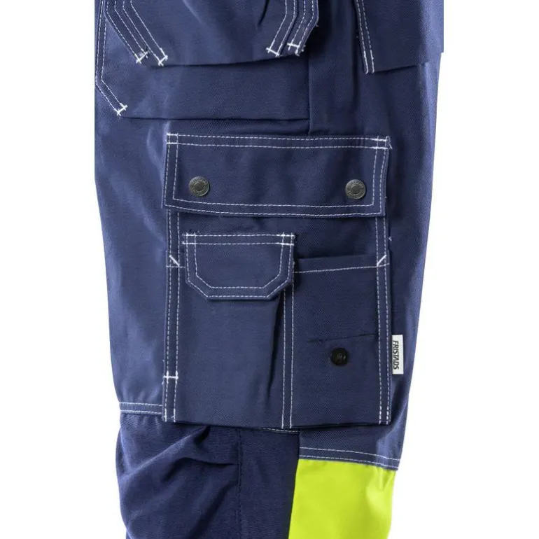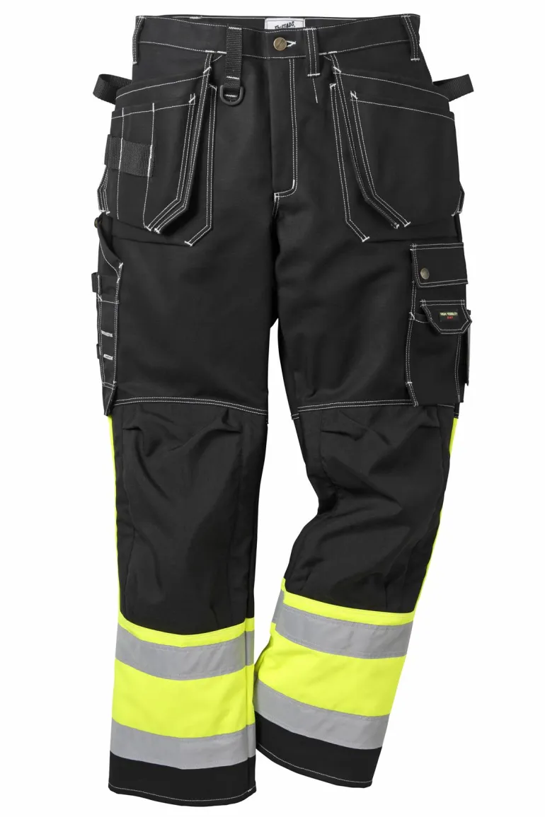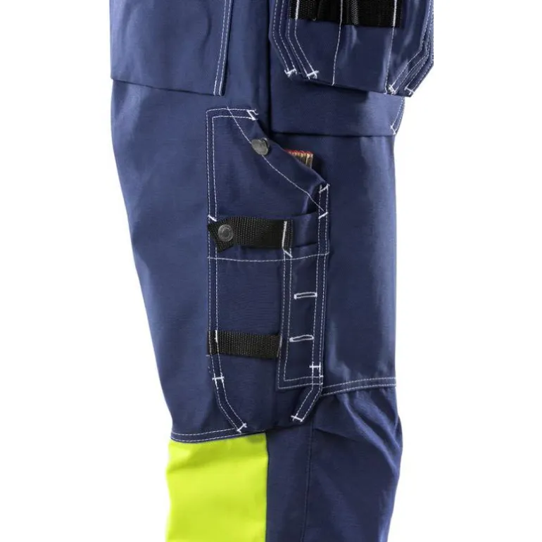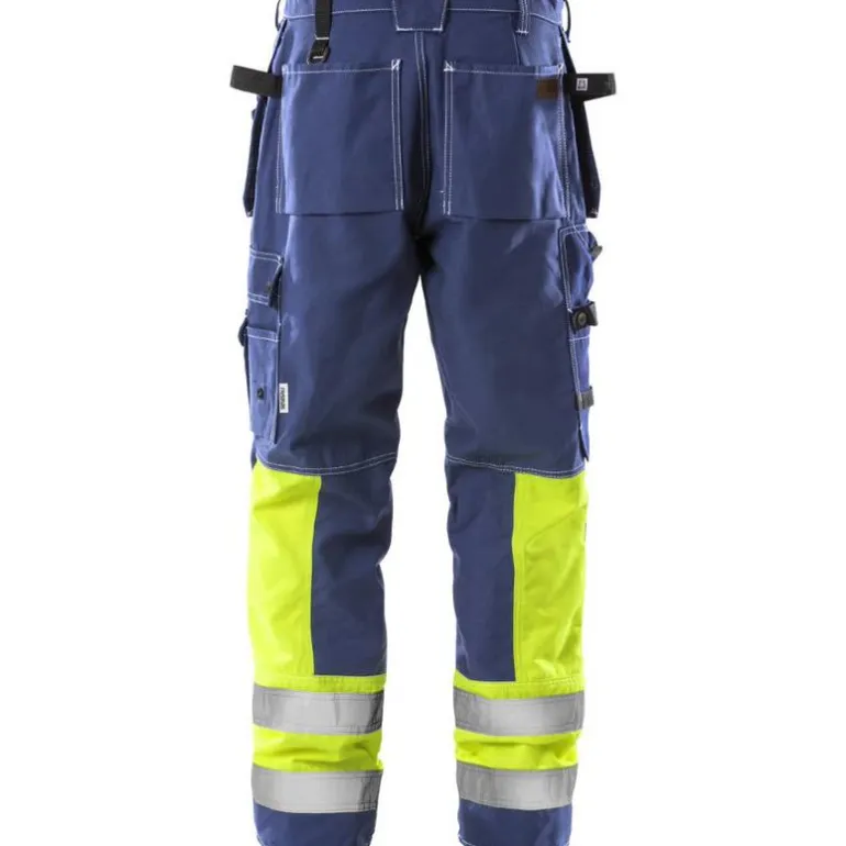 Huomiovärihousut FAS-puuvillaa, kaksi vapaasti riippuvaa, CORDURA-vahvistettua sisääntaitettavaa naulataskua – toisessa lisätasku, toisessa 3 pienempää taskua ja työkalulenkit. Housuissa on useita muita taskuja, kuten CORDURA-materiaalista valmistettu taittomittatasku, joka on sijoitettu kätevästi sivusauman päälle, työkalutasku ja kynätasku sekä kaksi nappia ja lenkkiä puukolle.