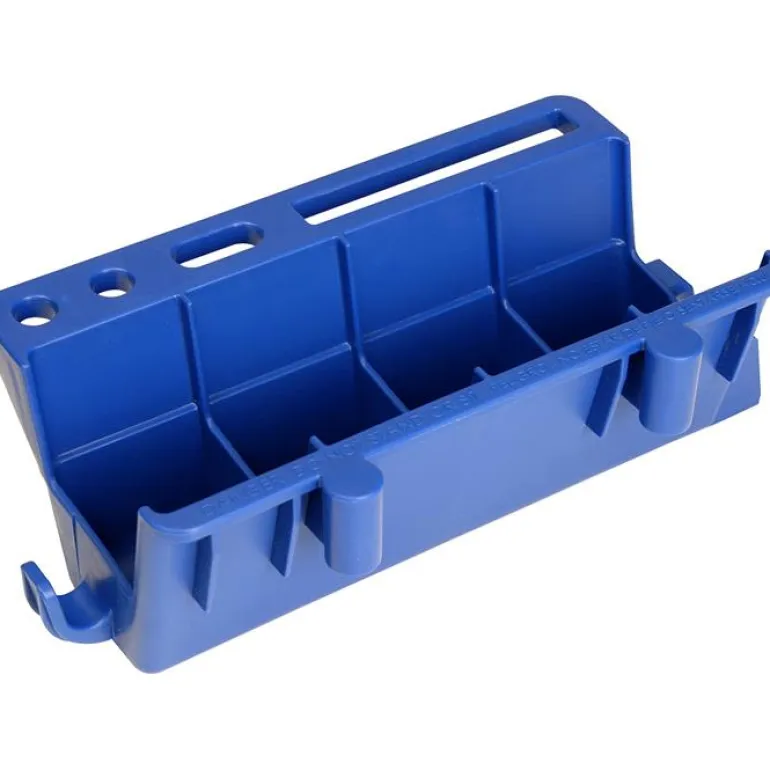 Työkaluhylly, jossa 4 erillistä lokeroa ja integroidut pidikkeet ruuvitaltoille, pihdeillä jne. Sivussa koukku ja kiinnike muita Lock-in-sarjan tarvikkeita varten.