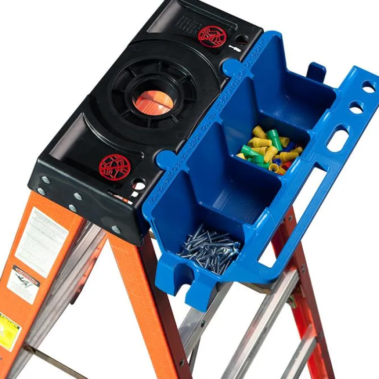 Työkaluhylly, jossa neljä erillistä lajittelulaatikkoa ja integroidut pidikkeet ruuvimeisseleille, pihdeille yms. Sopii Werner 716 -lasikuitutikkaisiin.