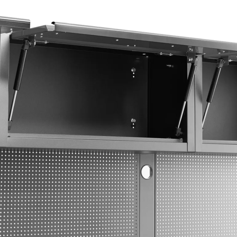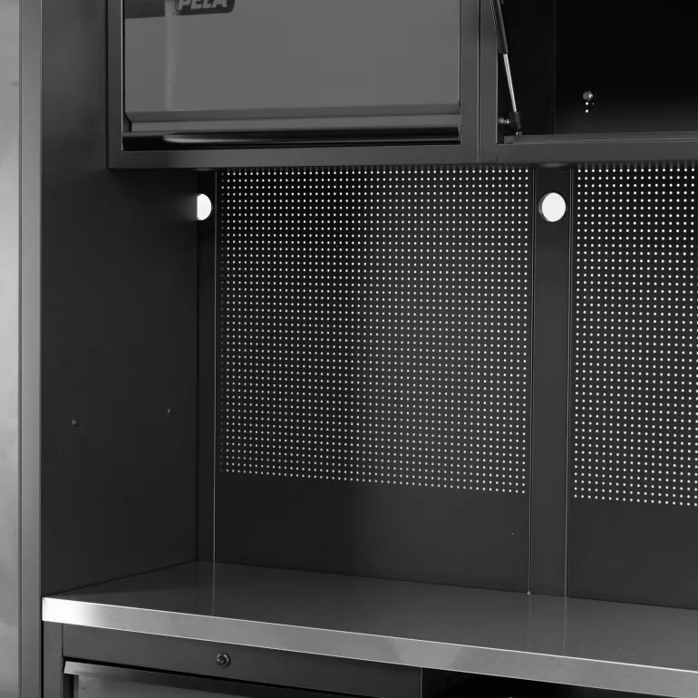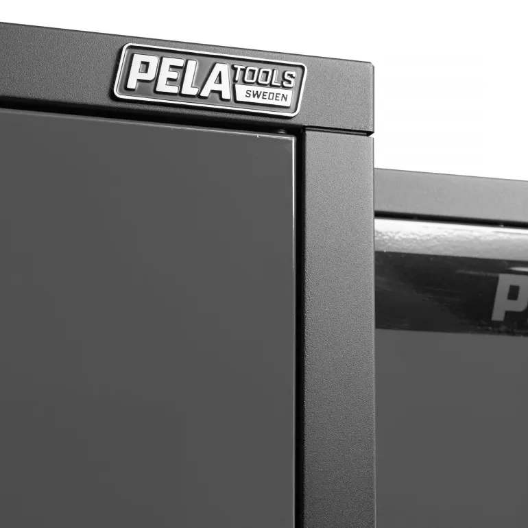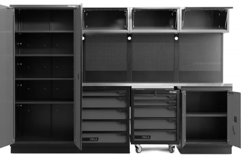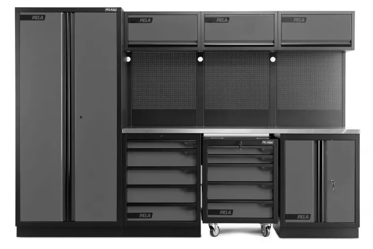 PELA 546213 on täydellinen kalustekokonaisuus autotalliin tai työpajaan (harmaa/musta), joka sisältää myös työkaluvaunun. Hitsaamalla valmistetut kaapit, jotka on helppo yhdessä työkalutaulujen kanssa koota yhdeksi vakaaksi moduuliksi tai työpistekokonaisuudeksi. Kalusteessa on paljon käytännöllisiä kaappeja, laatikoita ja säilytystiloja, joiden avulla voit järjestää työkalusi ja tarvikkeesi. Mukana tuleva ruostumattomasta teräksestä valmistettu työtaso on kestävä ja tyylikäs. Moduuli sisältää myös pyörillä varustetun työkaluvaunun, jota voidaan helposti siirrellä työtilassa ja varastoida työtason alle, kun tarvitaan enemmän tilaa. Työkalutaulut ovat yhteensopivia PELAn työkalukoukku- ja lisävarustevalikoiman kanssa. Korkea kaappi voidaan sijoittaa kalusteen molemmille puolille. Lähin värikoodi harmaa RAL 7016.