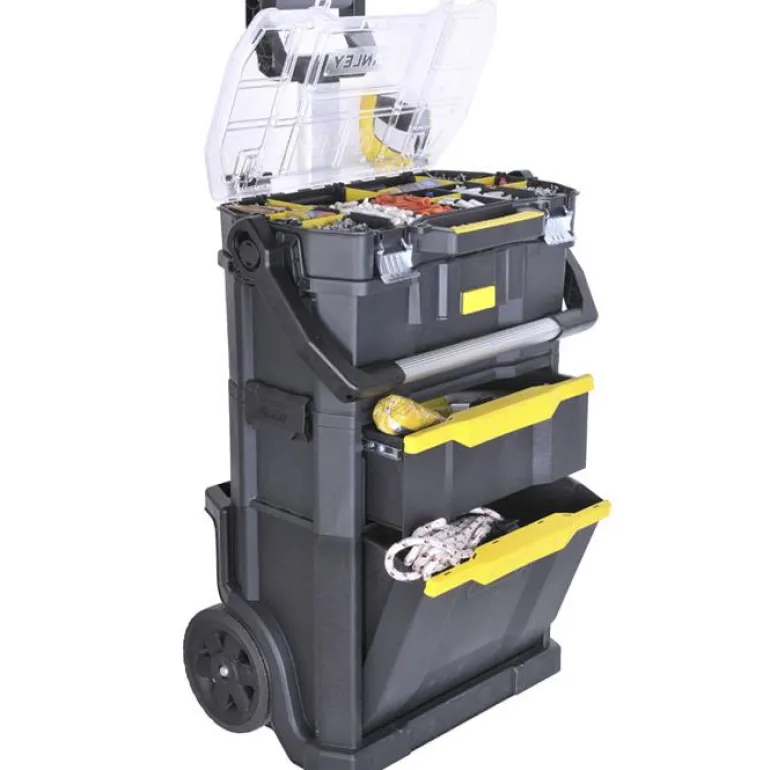 STANLEY STST1-79231 on modulaarinen (2-in-1), liikuteltava työkaluvaunu, jonka vetolaatikoiden kuulalaakerointi parantaa kestävyyttä ja helpottaa niiden käyttöä. Läpinäkyvän kannen ansiosta pientarvikkeet ovat hyvin esillä, ja ne on helppo ottaa käyttöön. Irrotettava työkalulaukku säästää aikaa. Säilytysratkaisu pitkille työkaluille. Helppo liikutella kestävien 7″ pyörien avulla. Moduulaarinen rakenne, jossa irrotettava työkalulaatikko.
