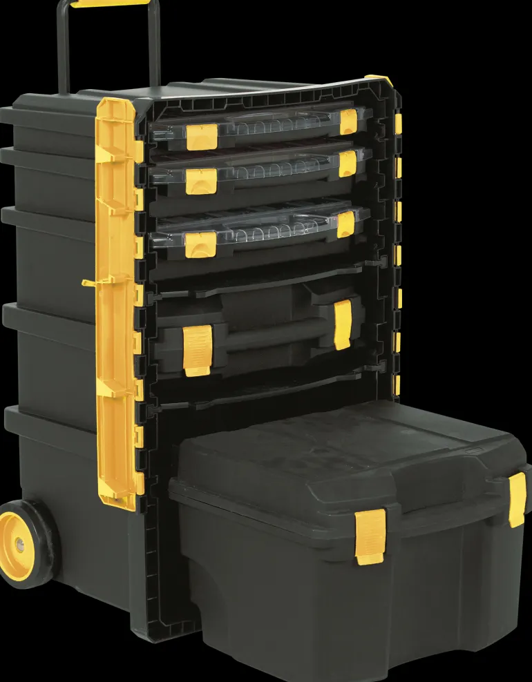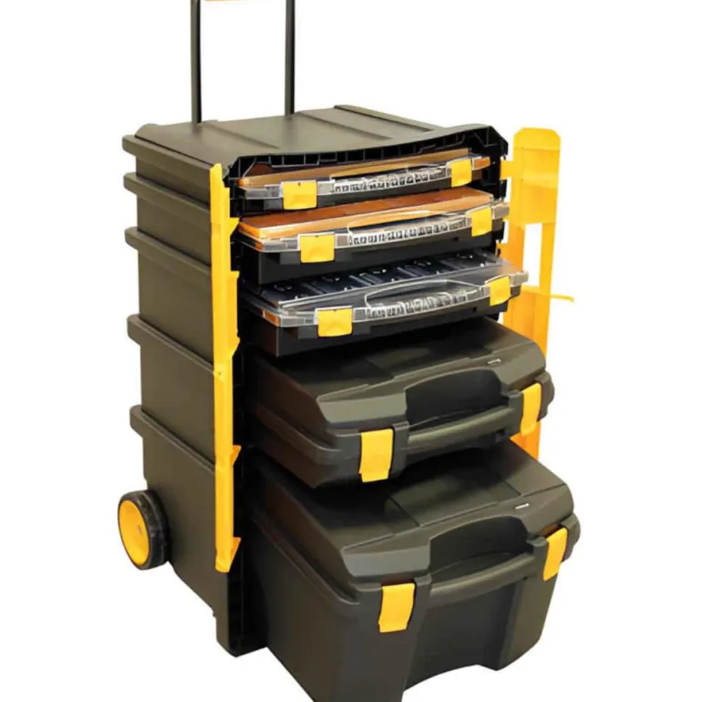 Säilytyslaatikosto kahdella pyörällä ja metallisella teleskooppisella vetokahvalla. Sisältää kolme valikoimalaatikkoa, joissa irroitettavat sisälaatikot, sekä työkalusalkun ja työkalulaatikon.