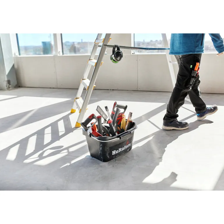 Hultafors TB-15 on vankasta PP-muovista valmistettu työkalukori monipuoliseen käyttöön. Työkalukorin takaosa on muotoiltu ergonomisesti, mikä parantaa käyttömukavuutta. Kätevä kahva voidaan lukita pystyasentoon, kun kori lasketaan maahan, mikä helpottaa korin uudelleen nostamista. Työkalukori on pinottavissa ja sen sisäpuolella on myös mitta-asteikko litroina.