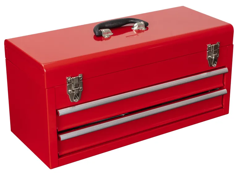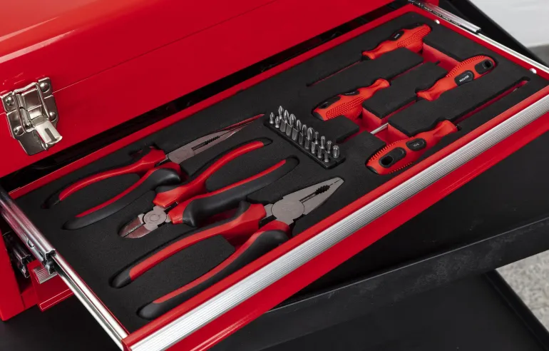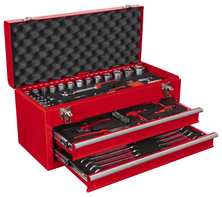 Työkalulaatikko 84 työkalulla, lajiteltuna vaahtomuovimoduuliin. Punaiseksi maalatussa teräspeltisessä laatikossa on yläkansi ja 2 ulosvedettävää säilytyslaatikkoa edessä.