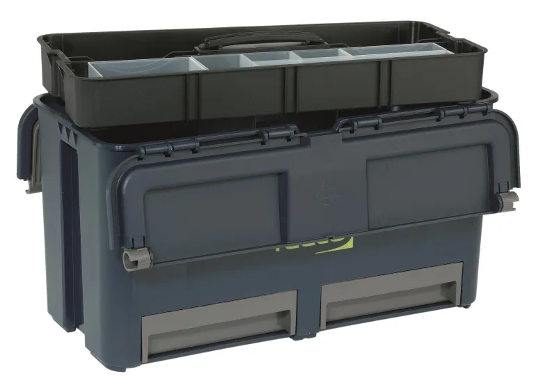 Vahvaa polypropeenia, kestää öljyjä ja kemikaaleja. Pyöristetyt kulmat. Irrallinen työkalulokero irrotettavilla väliseinillä. Pinottava. 2 ripustinkahvaa, jotka ala-asennossa lukitsevat kannen.