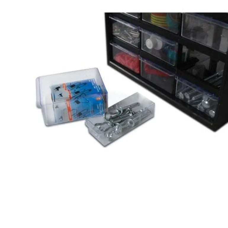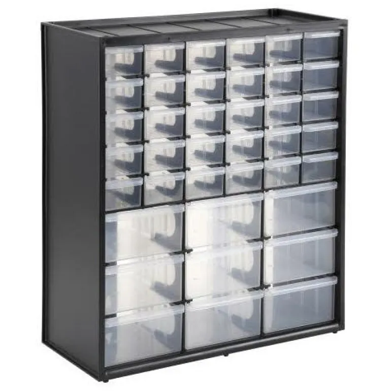 Muovinen työkalulaatikko. Voidaan ripustaa seinälle, kestävä hartsikehys. Helppo pinota ja muodostaa mukautettu järjestelmä. 9 isoa laatikkoa + L1074, 30 pientä laatikkoa.