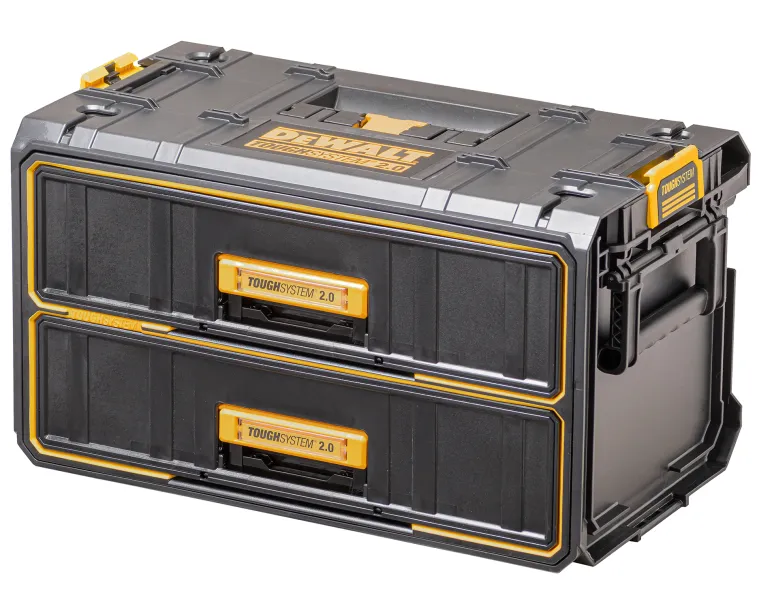 Dewalt TOUGHSYSTEM® 2.0 -työkalulaatikko kahdella ulosvedettävällä laatikolla. Kuulalaakeroidut laatikot, joissa luotettava ja kestävä avausmekanismi. Sivuilla automaattiset sivulukot, jotka mahdollistavat liittämisen muihin TOUGHSYSTEM® -laatikoihin ja TOUGHSYSTEM® -laatikoiden pinoamisen päällekkäin. Sivuilla myös kahvat. Voidaan liittää pyörälliseen TOUGHSYSTEM® -työkalupakkiin ja pakettiauton/työtilahyllyyn kiinnikkeiden avulla.