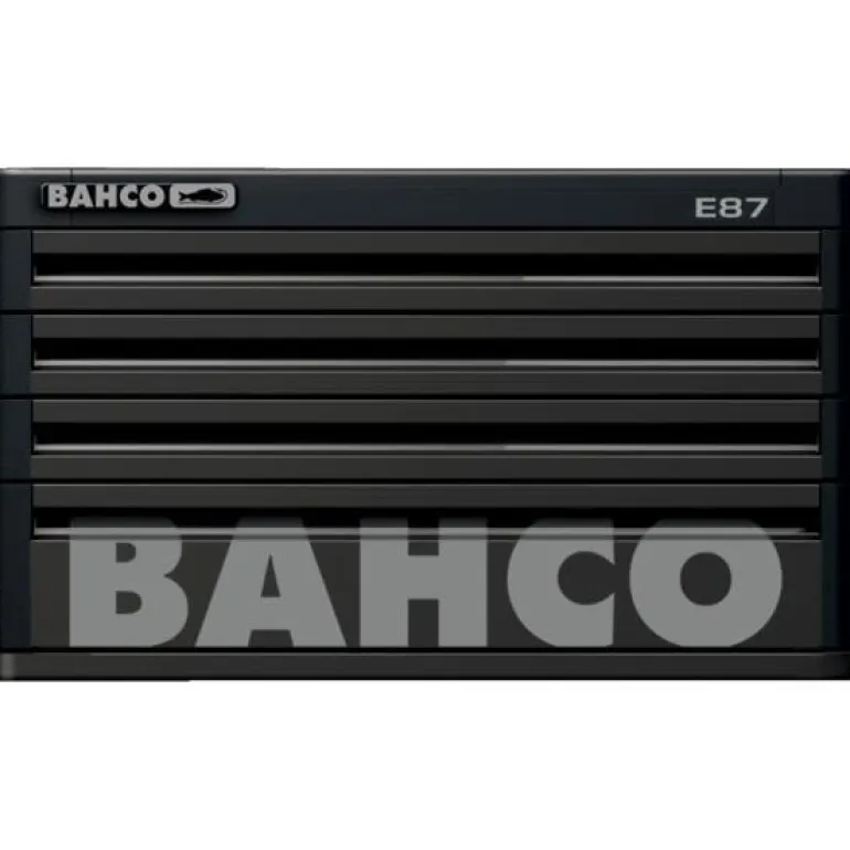 Bahco 1487K4BLACK on musta työkalulaatikosto, jossa kulmasuojukset ja 4 laatikkoa. DAAT-järjestelmän ansiosta vain yksi vetolaatikko voi aueta kerrallaan.