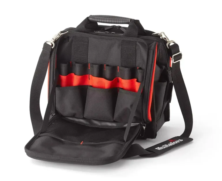 Keskilokero suurella suuaukolla, jonka tukiranka pitää sen halutessasi kokonaan auki työskentelyn aikana. Kaksi sivulokeroa monipuolisilla taskuilla ja työkalupidikkeillä. Vuorotteleva punainen ja musta kangas helpottaa eri työkalujen ja taskujen erottamista toisistaan. Sivulokeroiden vetoketjut aukeavat alas asti, jolloin voit taittaa ne kokonaan auki ja saat repun koko sisällön näkyviisi ja käyttöösi helposti. Laukussa on keskikokoisia läpällisiä ja vetoketjullisia taskuja herkkien laitteiden turvallista säilytystä varten. Siinä on myös ulkoinen rullamitan pidike, avaimenperän pidike, kynänpidikkeitä ja läpinäkyviä taskuja, joiden avulla löydät helposti etsimäsi.
