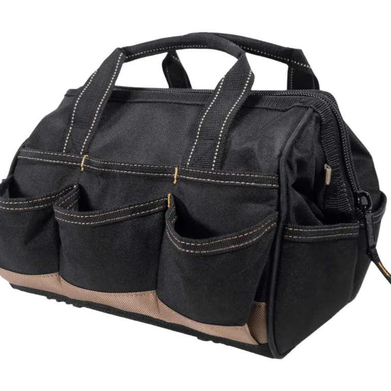 Työkalulaukku, joka sisältää lajittelulaatikon, jonka yläosassa on useita lokeroita, joihon on helppo pääsy. Laukussa on 21 työkalutaskua ja silmukkaa, vetoketjullinen etutasku, pehmustetut kahvat ja kulutusta kestävät kumijalat.