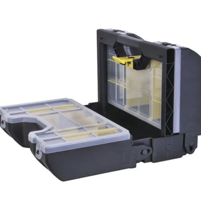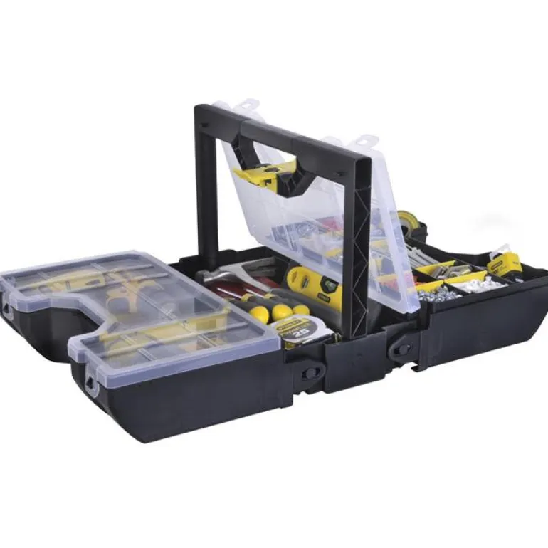 Työkalulaukku. 3 in 1 -kokoonpano, käsityökaluille, sähkötyökaluille ja tarvikkeille – 3-in-1. Kun laukku on avattu kokonaan, kaikki kolme säilytysosiota ovat käytettävissä samanaikaisesti. Sisäänrakennettu kaukalo suurten käsityökalujen säilytykseen. Siirrettävät jakajat mahdollistavat pienten osien, isompien työkalujen ja sähkötyökalujen joustavan säilytyksen. Kestävä sisäänrakennettu kahva ja tukeva rakenne takaavat turvallisen ja vakaan kuljetuksen.