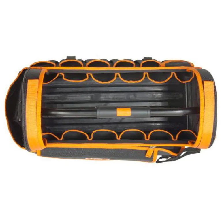 Käytännöllinen avomallinen työkalulaukku, jossa on sisä- ja ulkolokerot, ergonominen kahva sekä olkahihna. Mitat: 470x230x355 mm.