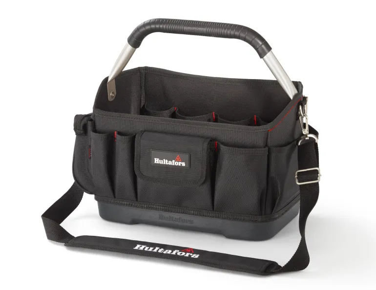 Laukun etu- ja takaosa ovat eri korkuisia, jolloin näet työkalusi helposti ja pääset niihin käsiksi edestä. Siinä on suuri keskilokero, jossa on runsaasti taskuja sekä työkalupidikkeitä. Siinä on keskikokoisia läpällisiä ja vetoketjullisia taskuja herkkien laitteiden turvallista säilytystä varten. Siinä on myös pidike rullamitalle, kynänpidikkeitä, avainpidike ja joustavia lenkkejä pienemmille työkaluille. Yhdessä sivutaskussa on sade- ja pölysuoja. Se on valmistettu ripstop-kankaasta ja suojaa laukkua ja sen sisältöä huonolta säältä, pölyltä ja lialta.