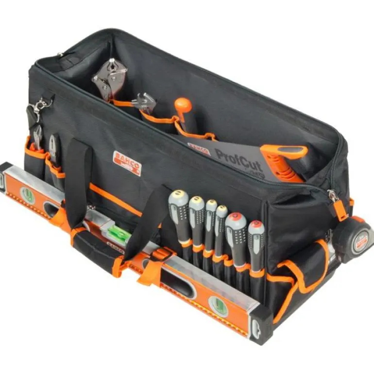 - Tekstiilinen työkalulaukku, jonka leveästä aukosta pääsee helposti käsiksi työkaluihin