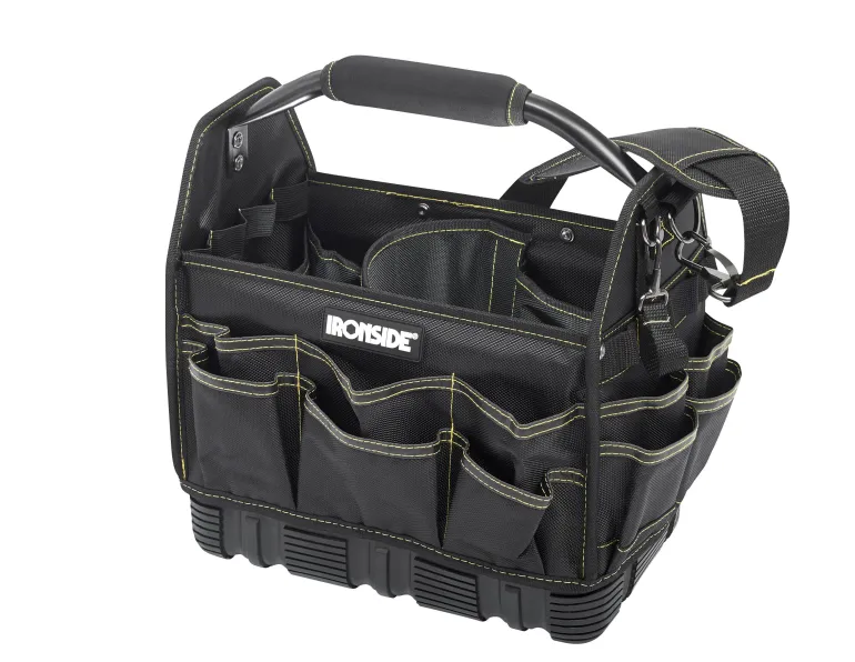 Vahvaa 1680D-nailonia, vedenpitävä kumipohja, teräksinen kantokahva EVA-kädensijalla sekä olkahihna. 22 sisä- ja ulkopuolista taskua sekä useita työkalupidikkeitä. Mittanauhapidike ja teippipidike. Toimitetaan ilman työkaluja