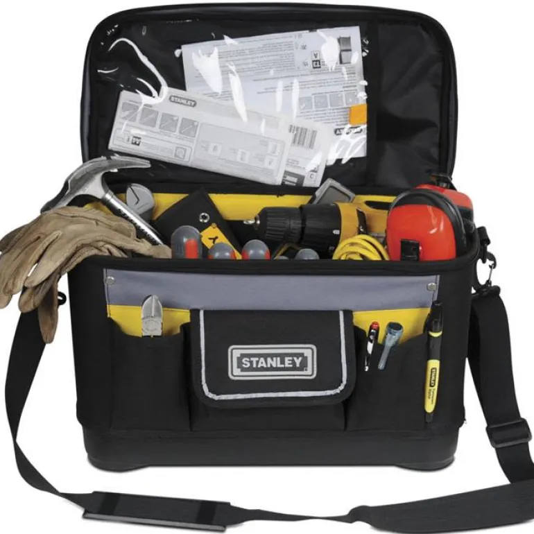 40 cm:n tukeva ja kestävä työkalulaukku, jossa on suljettavat etutaskut pienten osien ja henkilökohtaisten tavaroiden turvalliseen säilytykseen. Säädettävä olkahihna työkalujen vaivattomaan kuljetukseen. Useita sisä- ja ulkotaskuja, joiden ansiosta työkalut pysyvät hyvässä järjestyksessä. Erillinen läpinäkyvä asiakirjalokero auttaa pitämään asiakirjat ja henkilökohtaiset tavarat puhtaana ja suojassa. Tukeva vahvistettu muovipohja suojaa kosteudelta. Vahvistetut kulmat viimeistelevät tukevan muotoilun.