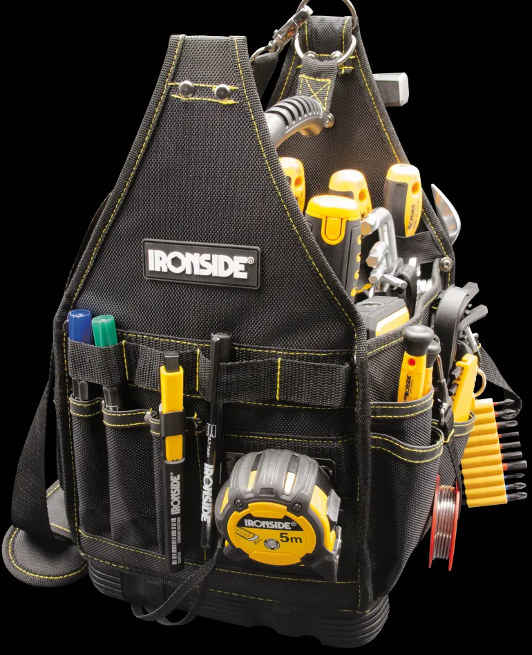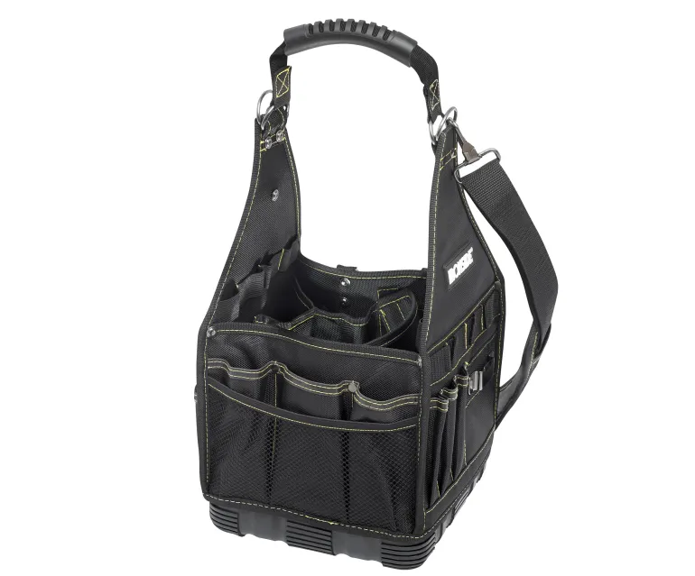 Vahvaa nailonia, vedenpitävä kumipohja, kuminen kantokahva ja olkahihna. Paljon sisä- ja ulkopuolisia taskuja ja pidikkeitä, mittanauhapidike, teippipidike, vahva karbiinihaka ja käyntikorttitasku. Sisällä irrotettava väliseinä, jossa työkalupidikkeitä. Toimitetaan ilman työkaluja.
