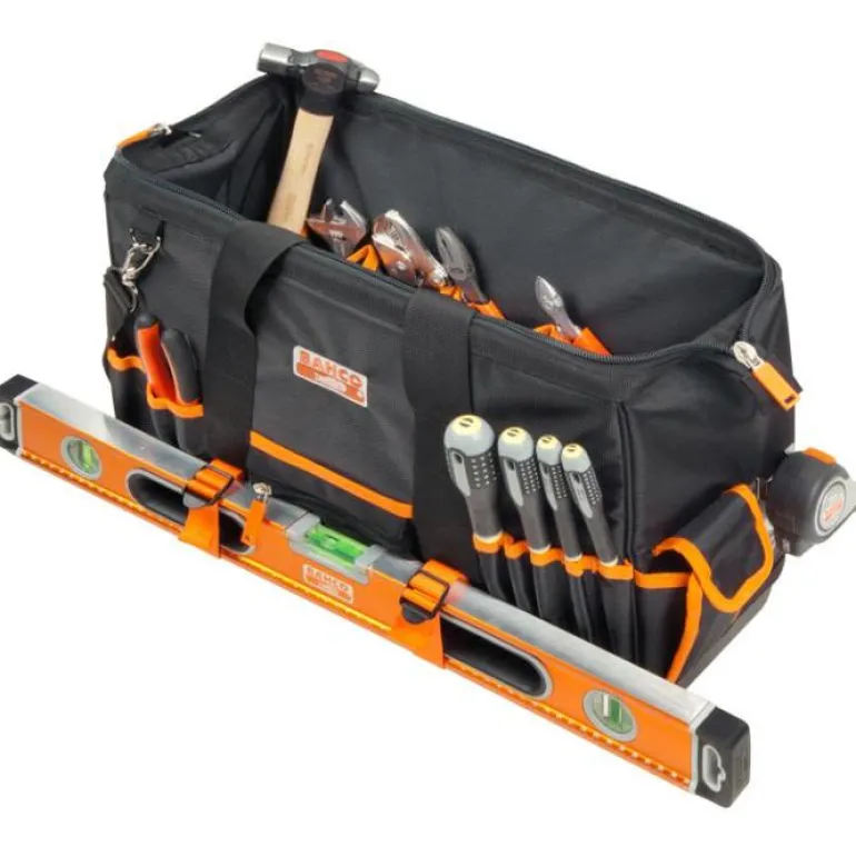 - Tekstiilinen työkalulaukku, jonka leveästä aukosta pääsee helposti käsiksi työkaluihin