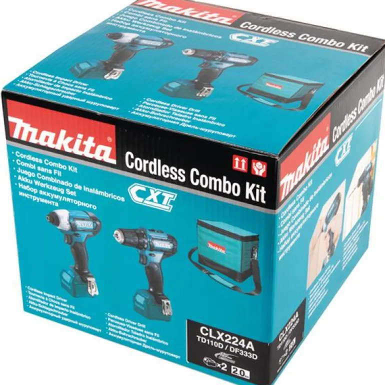 Makita CLX224A 12 V:n työkalusarja, joka sisältää porakoneen DF333DZ ja iskevän ruuvinvääntimen TD110DZ, kaksi 2,0 Ah:n akkua, laturin ja MAKPAC-työkalulaukun. Työkalupaketti sopii ihanteellisesti ahtaissa tiloissa työskentelyyn. LED-valo valaisee työkohteen. Ergonomisen kädensijan kumipinnoite takaa tukevan työskentelyotteen.