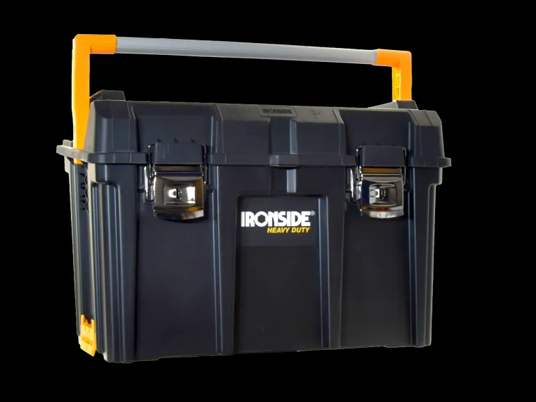Kestävä työkalupakki vahvoilla metallisoljilla. Kannessa tiiviste, joka tekee pakista vesitiiviin.