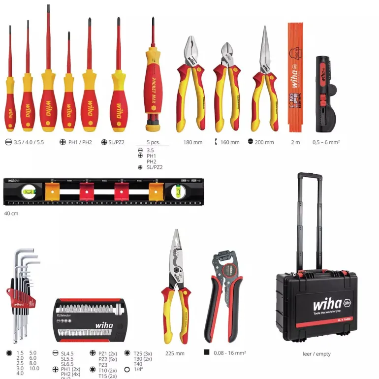 Kestävästä polypropeenista (PP) valmistettu salkku on lisäksi erityisen vahva ja iskunkestävä, joten työkalut on luotettavasti suojattu. Lukkojärjestelmä ja ilmanpaineen tasausventtiili mahdollistavat lisäksi työkalusalkun turvallisen kuljetuksen lentokoneessa. Pyörillä varustettu salkku sisältää kaikkiin ruuvaustöihin vaadittavat varusteet, kuusiokolosarjan ja kärkisarjan lisäksi kuusi ergonomista ja eristettyä SoftFinish® slimFix ruuvitalttaa ja kompaktin ja eristetyn PocketMax® electric -työkalun. Kaikkia pito-, syöttö- ja leikkaustoimintoja varten saatavilla myös eristetyt yhdistelmä-, lattapyörö- ja monitoimipihdit sekä sivuleikkuri. Nämä eristetyt ruuvaustyökalut ja pihdit takaavat turvallisen ja suojatun työskentelyn sähkölaitteiden parissa. Valikoimaa täydentää eristyksenpoistoon suunniteltu Multitool ja puristuspihdit. Wihan vesivaaka ja sähköasentajan nivelmitta täydentävät sähköasentajan työkaluvalikoimaa. Laukun kapasiteetti on jopa 100 kg ja paino tyhjänä 8,75 kg.