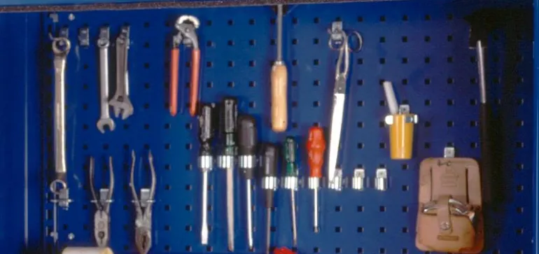 Työkalupaneeli JiWa MF4 -metallikaappiin. Kaappi voidaan sisustaa hyllyillä, ulosvedettävillä hyllyillä ja laatikoilla, työkalupaneeleilla ja muovilokereoille tarkoitetuille ripustuslistoilla.