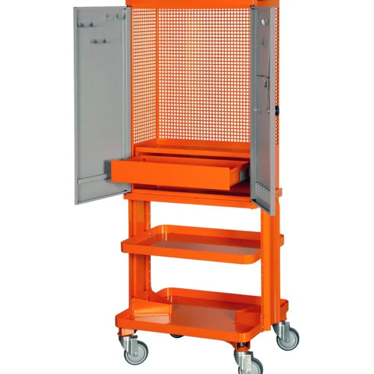 Lukittava työkalukaappi, jonka ovet voidaan avata 180º, joten kaapin sisältöön on esteetön pääsy Paneelin suorakulmaisten reikien ansiosta työkalukoukut voidaan kiinnittää joustavasti.