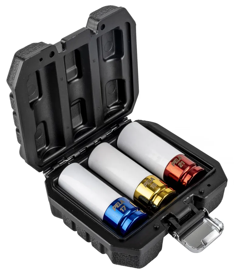 Pela 520116 on sarja rengashylsyjä (aluvannehylsyjä) varustettuna muovisuojalla alumiinivanteidesi suojausta varten. Sarja sisältää 3 kappaletta 1/2″-hylsyjä ko’oissa 17, 19 ja 21 mm.