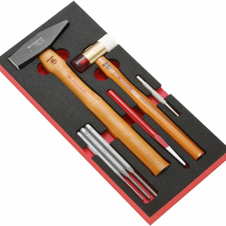 7 osainen työkalusarja, joka sisältää mekaanikon vasaran (1200 g), vasaran säädettävillä iskuilla, meisseli, keskikohdan- ja reiän.