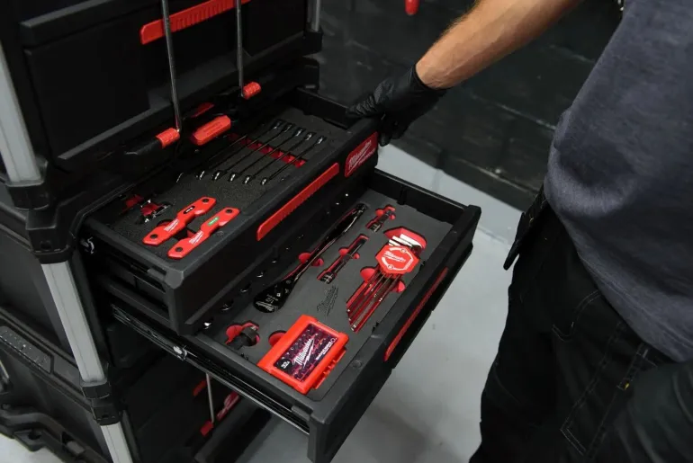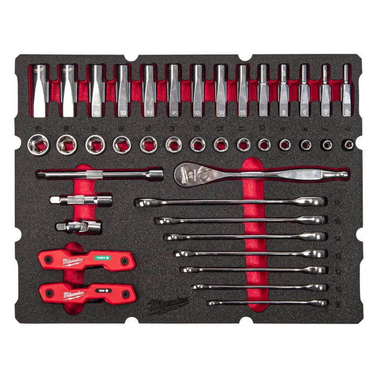 Milwaukee 4932493640 on 55-osainen ⅜″ räikkä- ja räikkälenkkiavainsarja vaahtomuovialustalla vetolaatikollisiin PACKOUT™-työkalupakkeihin (55-osainen). Sisältää ⅜″ hylsysarjan räikällä (32-osainen), metrinen (4932464945), MAX BITE™ -räikkälenkkiavainsarjan, metrinen (7-osainen) (4932464993), taitettavat kuusiokoloavaimet (8 kpl) (4932480978) ja Torx-kuusiokoloavaimet (8 kpl) (4932480979). Todella laadukas, laserleikattu vaahtomuovi istuu täydellisesti laatikoihin ja sen punainen taustaväri helpottaa oikeiden kokojen ja työkalujen paikantamista.