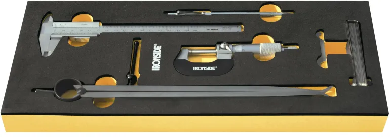 Mittaus ja merkintätyökalusarja 5 osaaSisältö:1 kpl työntömitta ruostumatonta terästä 0 – 150mm DIN 8621 kpl mikrometri 0 – 25 mm tarkkuus 0,01 mm1 kpl jalkaharppi, aukeama 250 mm1 kpl piirtopuikko kuusikulmaisella varrella, halkaisija 6mm, taskupidike, pituus 145 mm1 kpl rakomitta 20 lehteä 0,05 – 1 mm