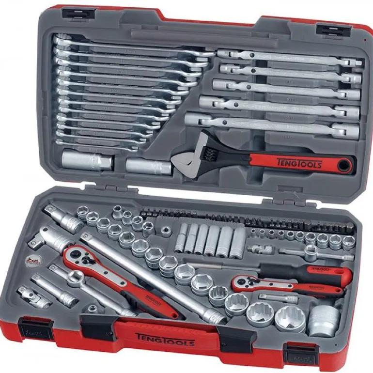 Teng Tools TM106 on 106-osainen työkalusarja. Sisältää 1/4″ ja 3/8″ lyhyet kuusiokolohylsyt, 1/4″ pitkät kuusiokolohylsyt, 3/8″ sytytystulppahylsyt, 1/2″ lyhyet kuusiokolohylsyt, kuituvahvisteisen räikkäkahvan, yleisnivelet, kärkihylsyt, jatkotangot, bi-flex-avaimen, kärkiruuvitalttan, suurennus- ja pienennystapit, kaksoisnivelhylsyavaimet, U-rengasavaimet, U-rengasavaimen kiinnitysrenkaan, jakoavaimen ja 1/4″ kuusiokolokärjen – pituus 25 mm. Toimitetaan muovilaatikossa, jossa metallinen turvalukko, taittuva kahva ja saranoissa metalllitapit.